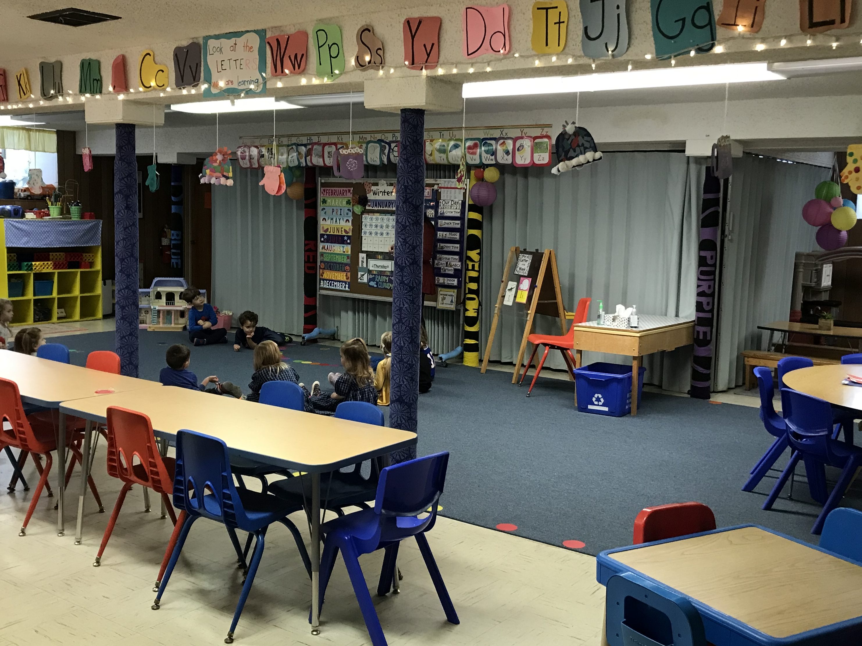East Aurora Preachool Center is located in the lower lever of the East Aurora Christian Church on the corner of North Grove and Main Street in the village of East Aurora. Our space offers multiple areas for learning and play, complete with sensory table, cozy reading library with soothing globe lights, dress-up and dramatic play area where a child’s only limit is his imagination, large open floor space for building blocks, and tables to sit at during play time, snack, and small group instruction.